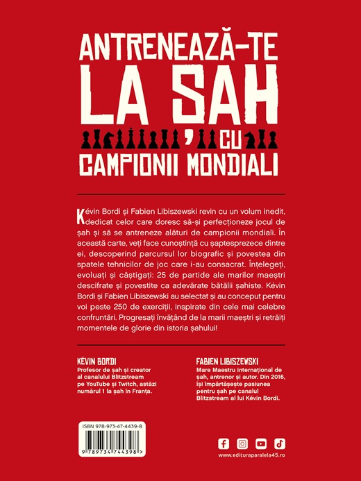 Kévin Bordi și Fabien Libiszewski revin cu un volum inedit, dedicat celor care doresc să-și perfecționeze jocul de șah și să se antreneze alături de campionii mondiali. În această carte, veți face cunoștință cu șaptesprezece dintre ei, descoperind parcursul lor biografic și povestea din spatele tehnicilor de joc care i-au consacrat. Înțelegeți, evoluați și câștigați: 25 de partide ale marilor maeștri descifrate și povestite ca adevărate bătălii șahiste. Kévin Bordi și Fabien Libiszewski au selectat și au conceput pentru voi peste 250 de exerciții, inspirate din cele mai celebre confruntări. Progresați învățând de la marii maeștri și retrăiți momentele de glorie din istoria șahului!