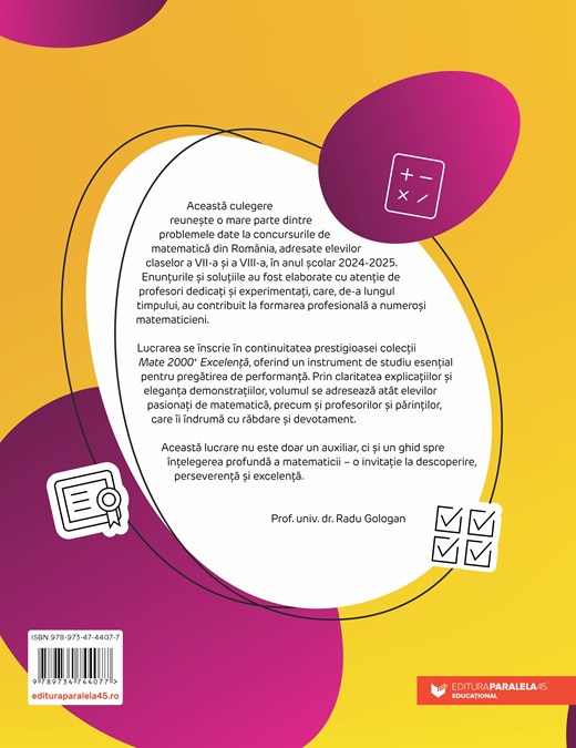 Lucrarea se înscrie în continuitatea prestigioasei colecții Mate 2000+ Excelență, oferind un instrument de studiu esențial pentru pregătirea de performanță. Prin claritatea explicațiilor și eleganța demonstrațiilor, volumul se adresează atât elevilor pasionați de matematică, precum și profesorilor și părinților, care îi îndrumă cu răbdare și devotament.