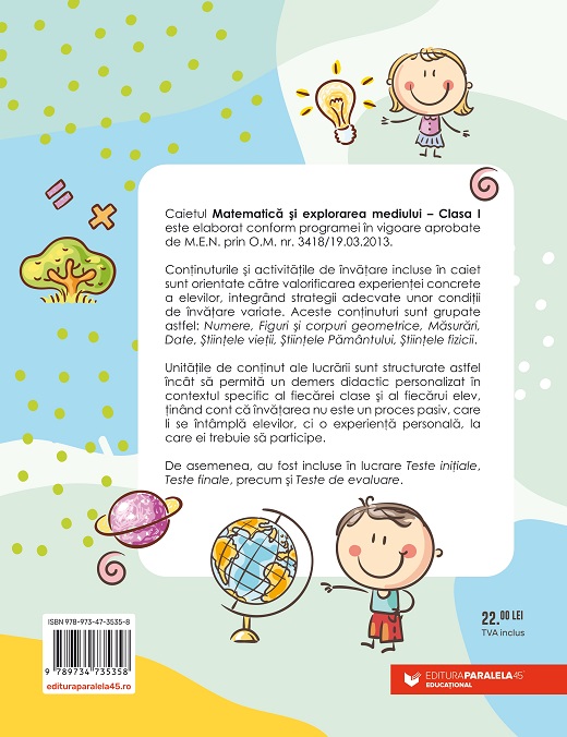 Caietul Matematică și explorarea mediului – Clasa I este elaborat conform programei în vigoare aprobate de M.E.N. prin O.M. nr. 3418/19.03.2013.
