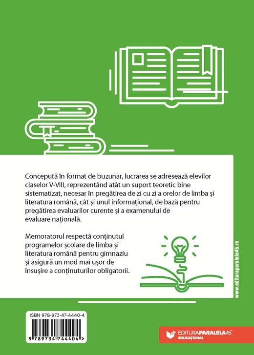 Memoratorul respectă conținutul programelor școlare de limba și literatura română pentru gimnaziu și asigură un mod mai ușor de însușire a conținuturilor obligatorii.