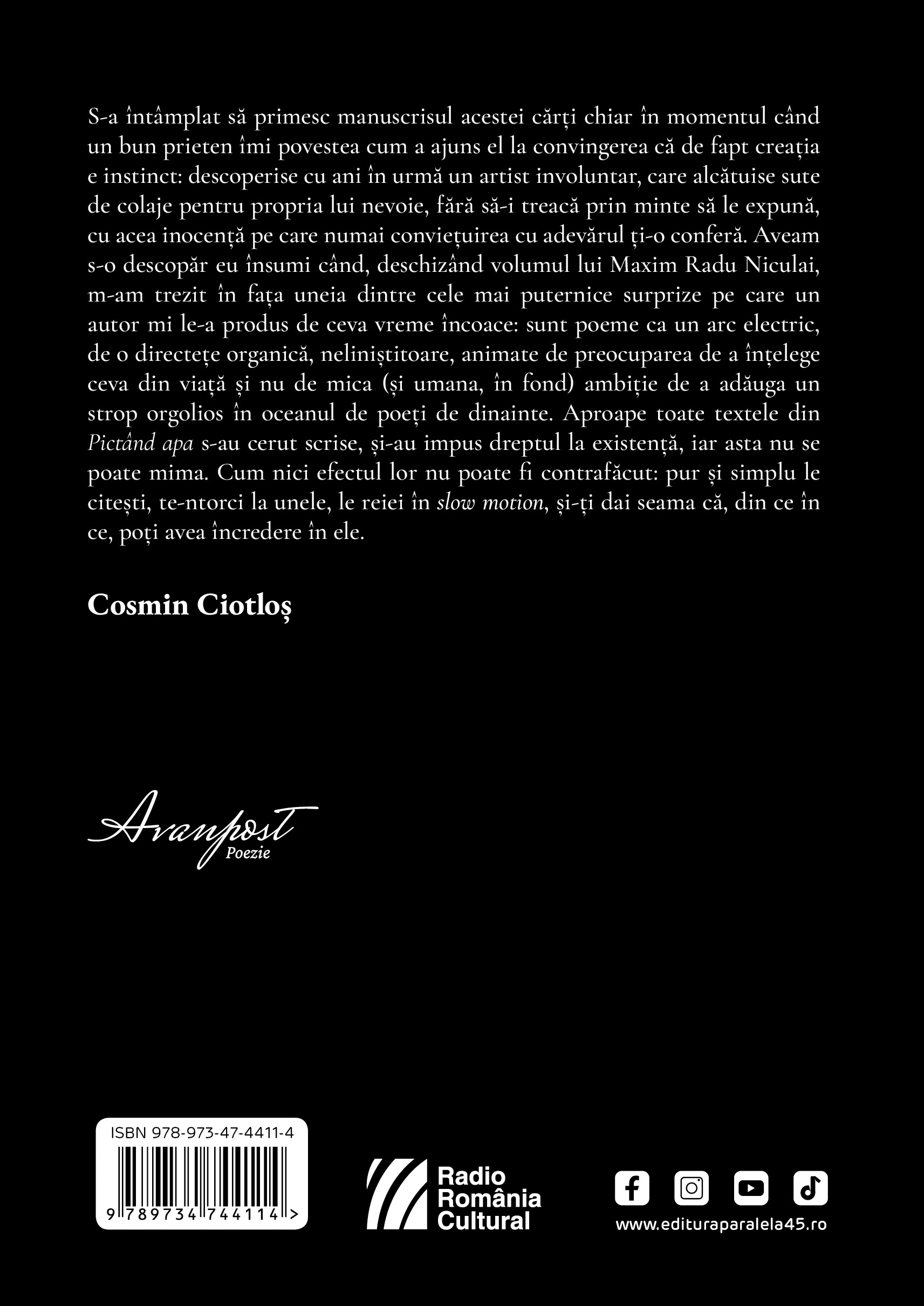 S-a întâmplat să primesc manuscrisul acestei cărți chiar în momentul când un bun prieten îmi povestea cum a ajuns el la convingerea că de fapt creația e instinct: descoperise cu ani în urmă un artist involuntar, care alcătuise sute de colaje pentru propria lui nevoie, fără să-i treacă prin minte să le expună, cu acea inocență pe care numai conviețuirea cu adevărul ți-o conferă. Aveam s-o descopăr eu însumi când, deschizând volumul lui Maxim Radu Niculai, m-am trezit în fața uneia dintre cele mai puternice surprize pe care un autor mi le-a produs de ceva vreme încoace: sunt poeme ca un arc electric, de o directețe organică, neliniștitoare, animate de preocuparea de a înțelegeceva din viață și nu de mica (și umana, în fond) ambiție de a adăuga un strop orgolios în oceanul de poeți de dinainte. Aproape toate textele din Pictând apa s-au cerut scrise, și-au impus dreptul la existență, iar asta nu se poate mima. Cum nici efectul lor nu poate fi contrafăcut: pur și simplu le citești, te-ntorci la unele, le reiei în slow motion, și-ți dai seama că, din ce în ce, poți avea încredere în ele.
